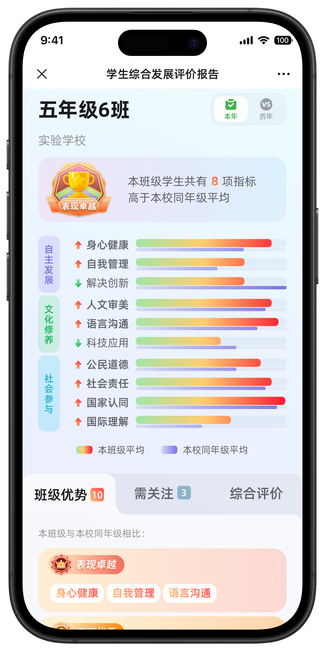 一、班级画像:把握发展全景,找准成长坐标 班级画像作为整个报告的首要内容和核心内容,块借助柱状图,清晰呈现班级学生在三大维度,10个指标的整体表现;柱子长度可直观反映本班学生在对应指标上的发展水平,同时与本校同年级班级的平均值开展横向对比,了解班级学生群体的能力定位。通过班级优势项可以快速掌握班级优势领域,通过优势领域增加学生自信,带动全面发展。 |