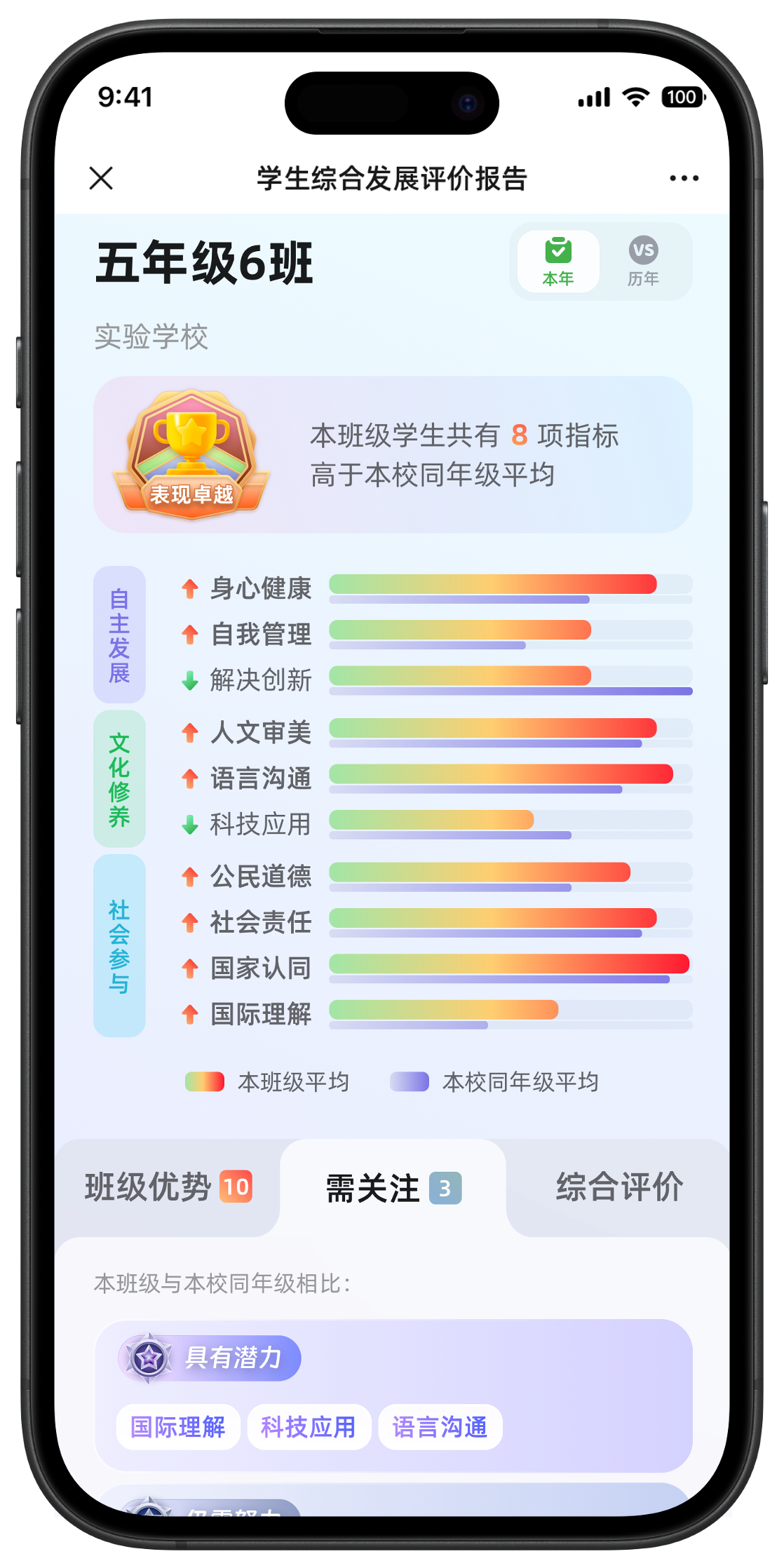 二、需关注:精准预警薄弱项,形成改进指南 在“需关注”中通过数据对比和标签提示,快速识别班级的薄弱项。比如示例班级在“解决创新”和“科技应用”维度低于年级平均水平,教师可直接锁定发力方向,将经验判断与客观诊断结合,更好地引导学生发展。 |