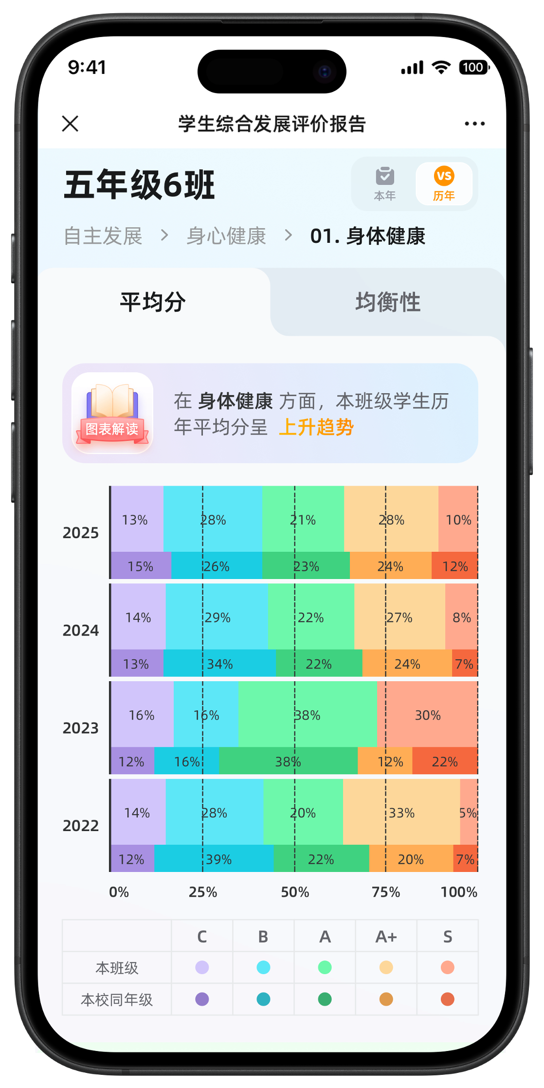 四、历史对比:追溯成长轨迹,把握发展趋势 报告不仅提供本年度数据,还同步呈现各项能力要点的历史数据对比,通过堆叠柱状图展现班级学生历年能力的等级分布变化,助力教师清晰把握班级学生的成长轨迹。帮助教师结合实际情况动态调整教育教学策略。 |