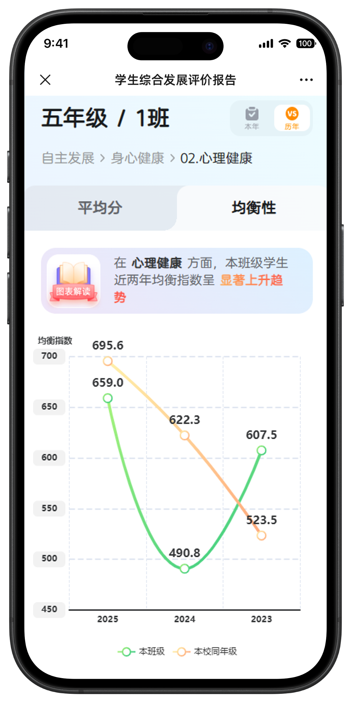 五、均衡性趋势:量化能力差异,促进学生共同发展 报告还通过折线图对每项能力要点的均衡性变化趋势进行了呈现。均衡指数越高,说明班级学生能力水平越集中,差异越小;指数越低,说明能力分布越分散,存在两极分化或薄弱群体。例如示例中班级数据,心理健康均衡指数从2023年的523.5升至2025年的695.6,说明该班级学生心理健康水平越来越均衡。帮助教师持续掌握班级学生群体的差异变化态势,关注薄弱的学生群体,促进学生共同发展。 |