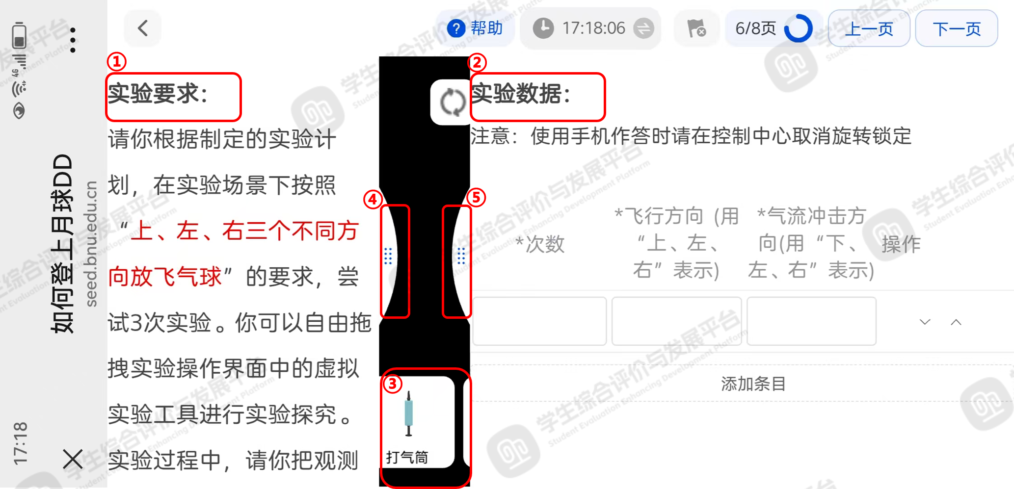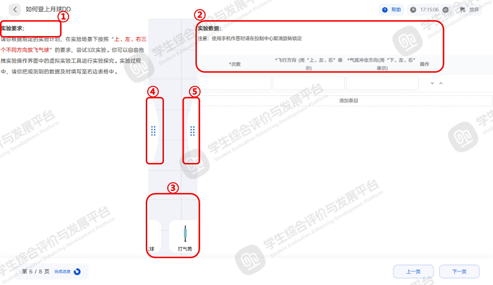 根据标记①区域的【实验要求】完成线上实验,点击标记④可收起左侧【实验要求】,点击标记⑤可收起右侧【实验数据】,同时收起标记④和标记⑤,进入全屏实验模式。完成实验后,填写标记②区域的【实验数据】,可点击【添加条目】填写更多实验数据,如下图4。