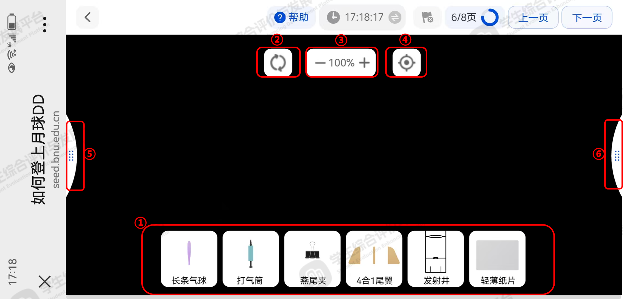 进入全屏模式,点击标记①可选择需要的实验工具拖拽至工具栏上方的实验区域,点击标记②可重置(清空)页面,点击标记③的“+”和“-”可放大或缩小页面,点击标记④可复位页面,点击标记⑤和标记⑥打开两侧导航栏,如下图5。
