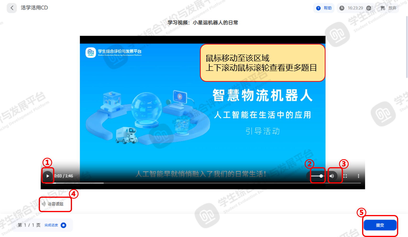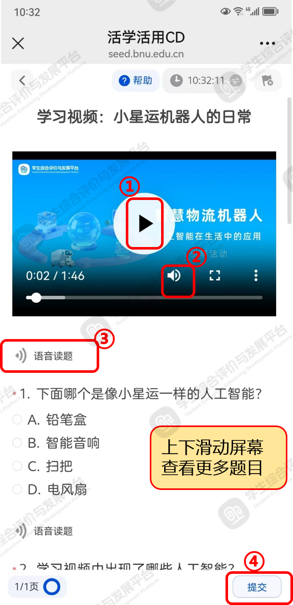 点击标记①【播放】按钮播放学习视频,点击标记②【声音】按钮,调节声音,点击标记③可实现【语音读题】,完成全部题目后,点击标记④【提交】本活动。请注意,当页面内容过多时,可上下滑动屏幕,查看完整题目,如下图1。