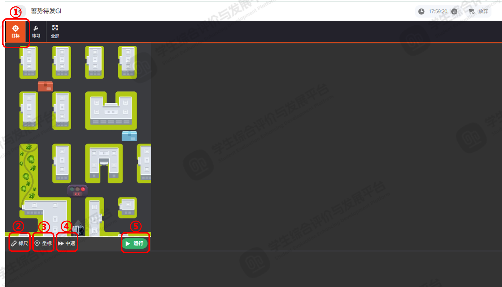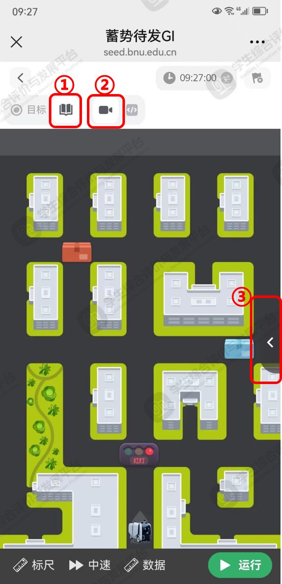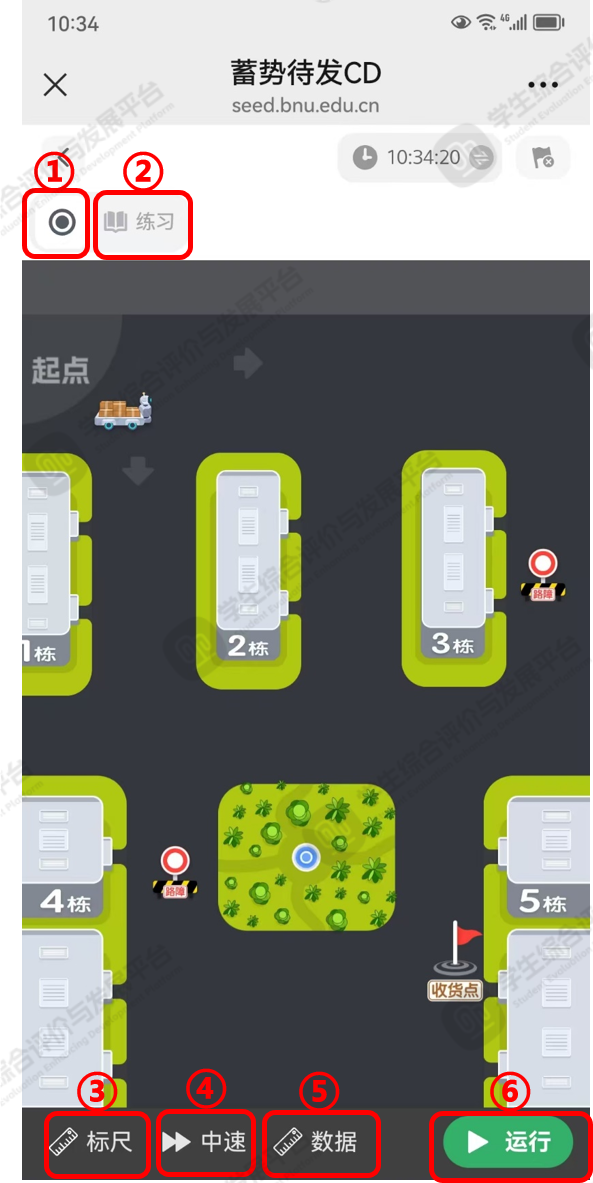 点击⑥【运行】按钮,可展示当前测评需要达成的编程结果。