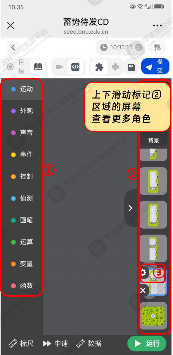 如图4所示,进入角色编辑页面,在标记①中选择的模块或自己编写的Python程序将对页面的标记②区域的不同角色进行控制。请在标记②处先选中角色,上下滑动标记②区域页面,查看更多角色,被选中的角色显示蓝色边框,再点击选中角色的标记③【设置】按钮进行编辑操作。