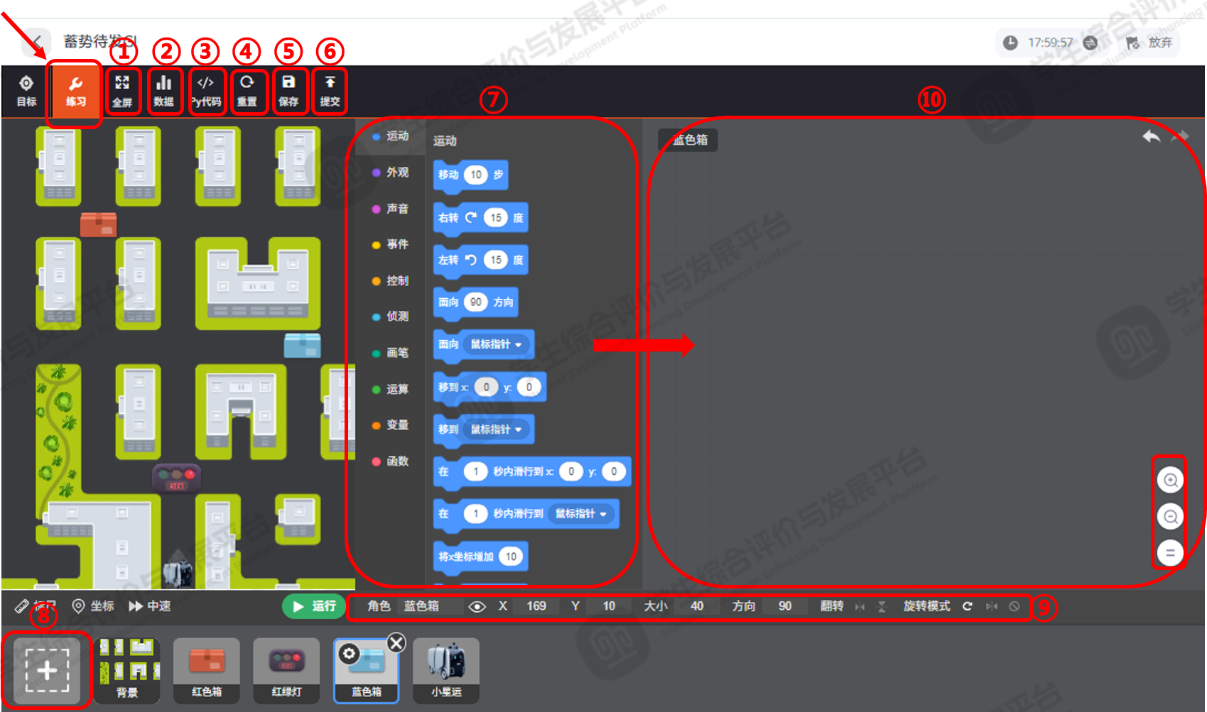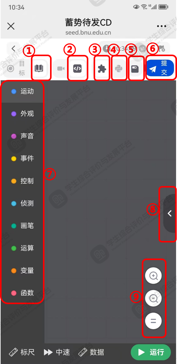 如图3所示,在标记①【练习】模式下,点击标记②【编程】按钮,可切换为编程视图。在编程视图中可实现如下功能: