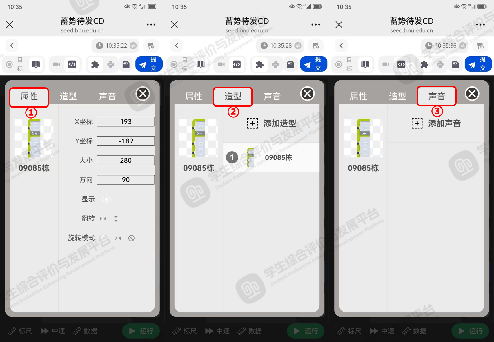点击上图4的标记③【设置】按钮,进入选中角色的参数页面,如下图5所示,点击标记①【属性】按钮,编辑该角色的坐标、大小、方向等参数,点击标记②【造型】按钮,编辑该角色的造型参数,点击标记③【声音】按钮,编辑该角色声音参数。